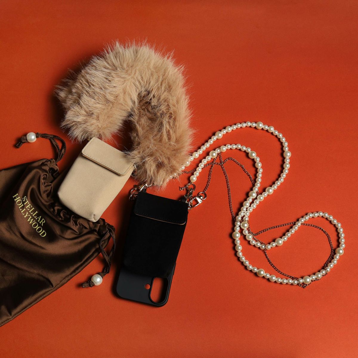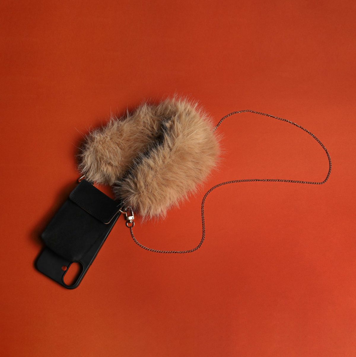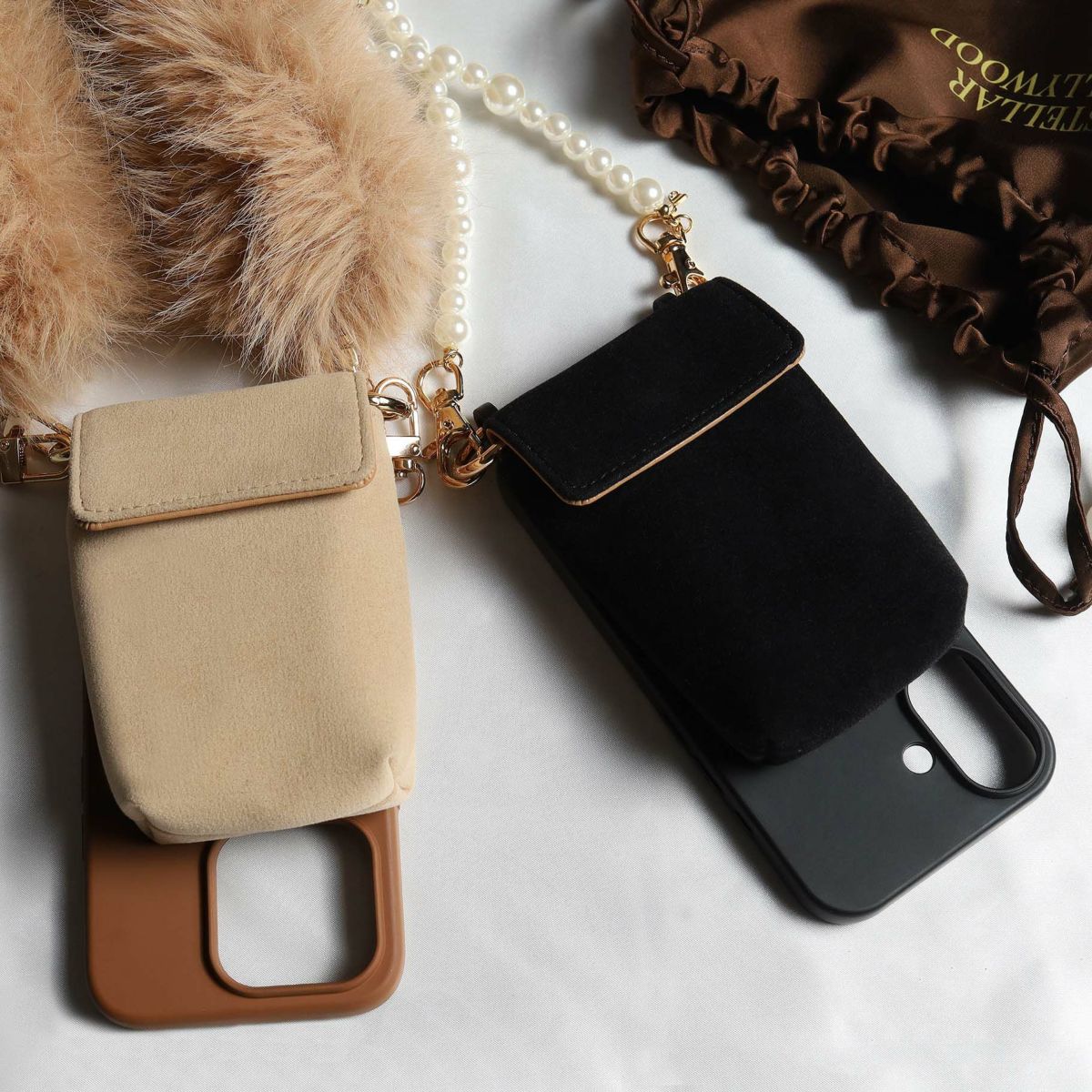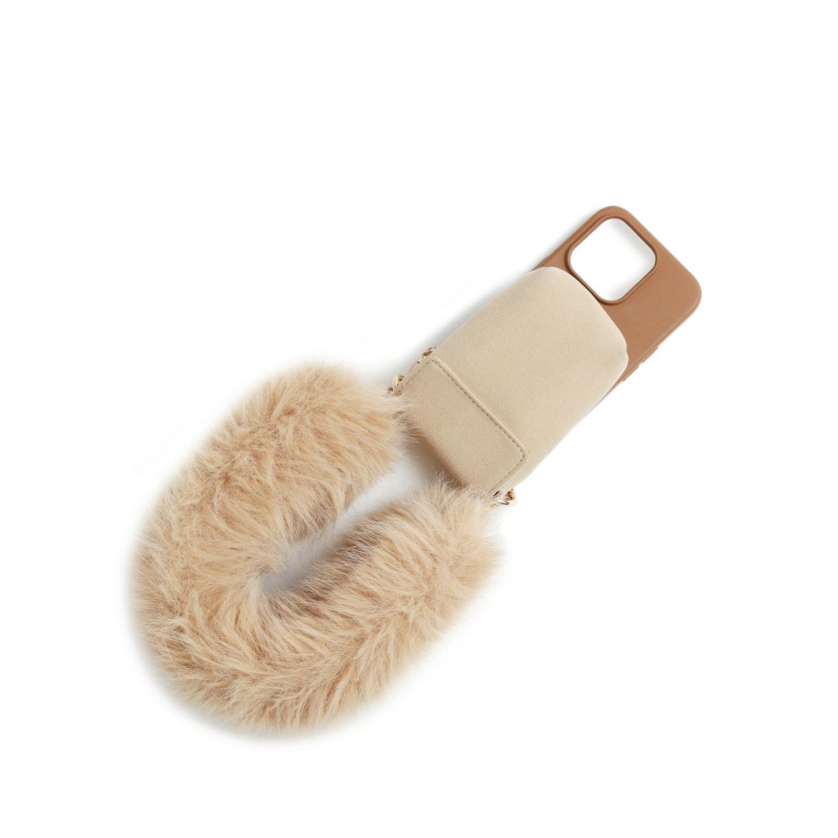 プティポーチチェーン付きiPhoneケース ファーハンドル(ブラウン)