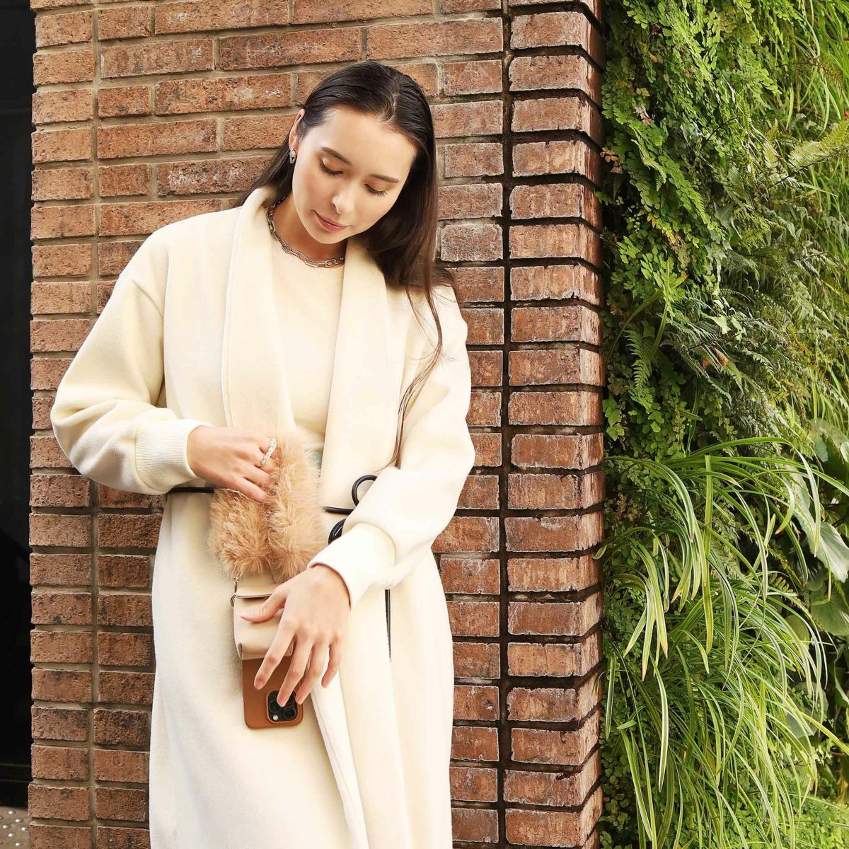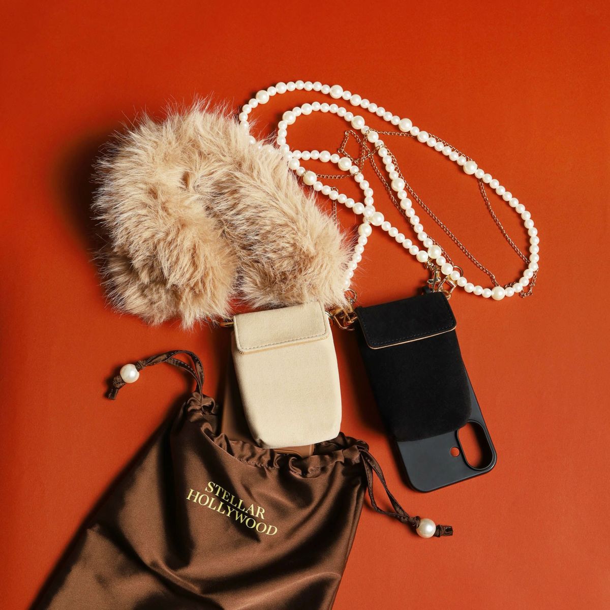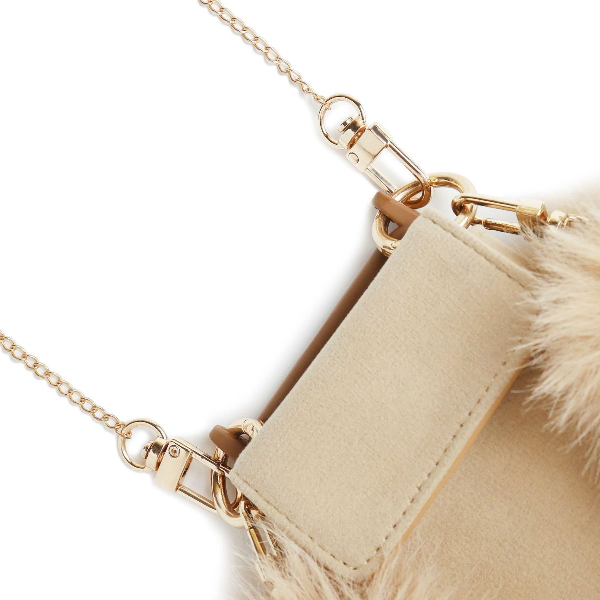 プティポーチチェーン付きiPhoneケース ファーハンドル(ブラウン)