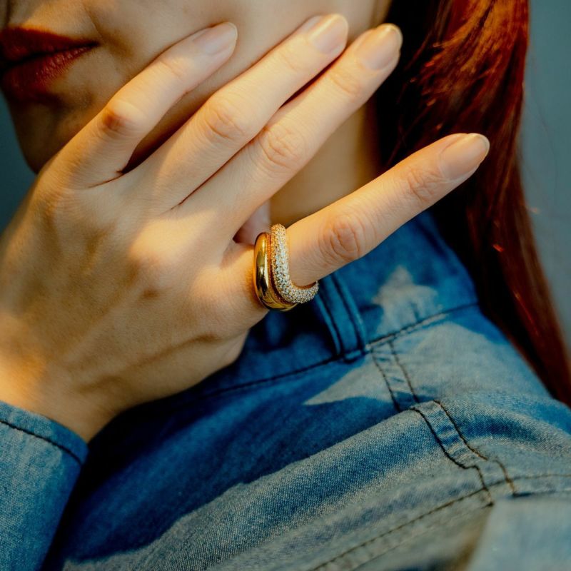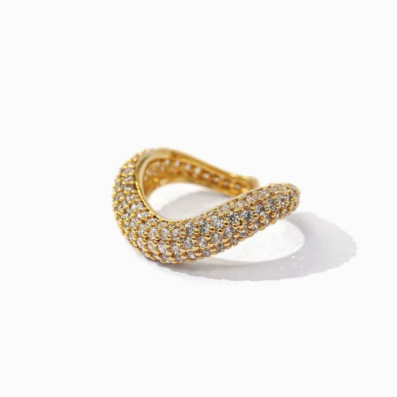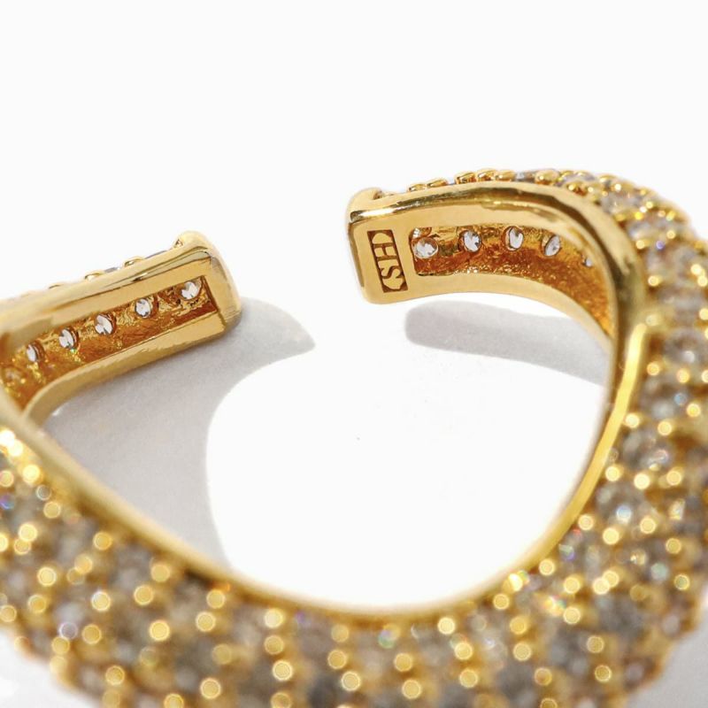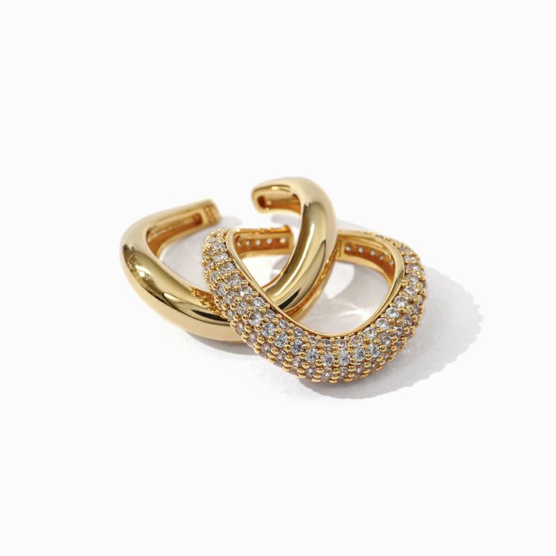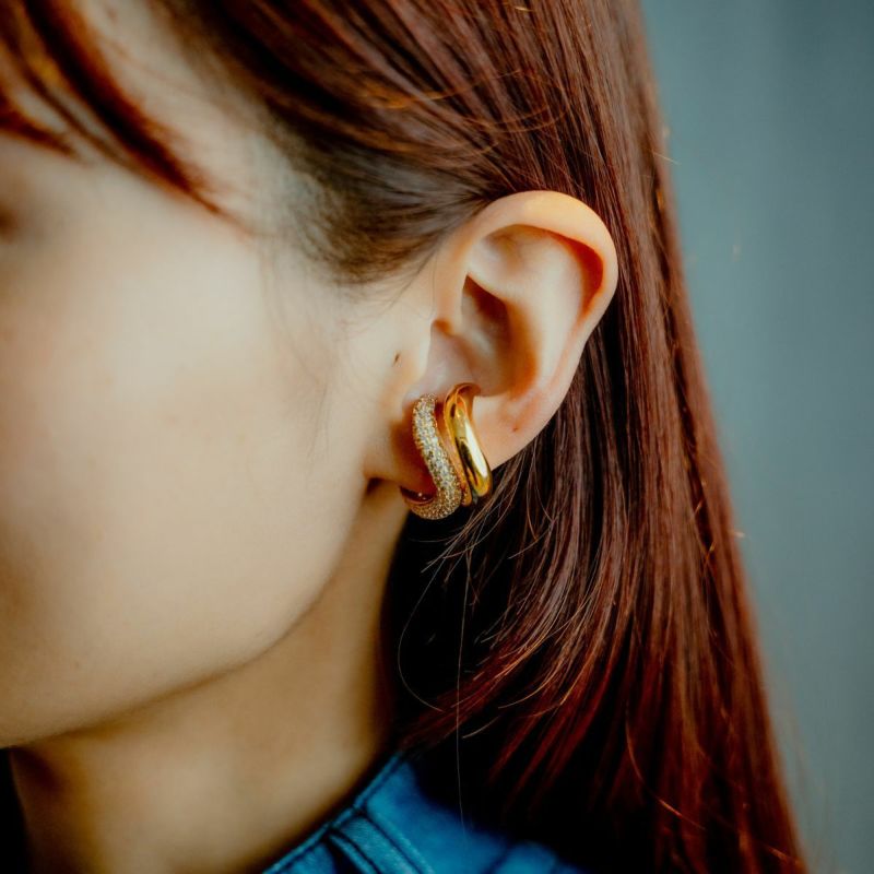 イヤーカフとしてもリングとしても楽しめるマルチなアイテム。表情が異なる2本セットなのでコーデイネートの幅が広がるのも嬉しいポイントです。K18コーティングが贅沢にあしらったジルコニアの輝きを際立たせ、ラグジュアリーな雰囲気に。ゆるやかな曲線にすることで立体感が出て耳元、手元をしなやかに馴染んで上品な印象にしています。コーディネートを選ばずカジュアルにもきれいめにもデイリーに活躍してくれるアイテムです。同シリーズのネックレス、ブレスレットと合わせてより華やかな印象に。フォーマルシーンはもちろん、女子会など幅広いシーンでお使いいただけます。