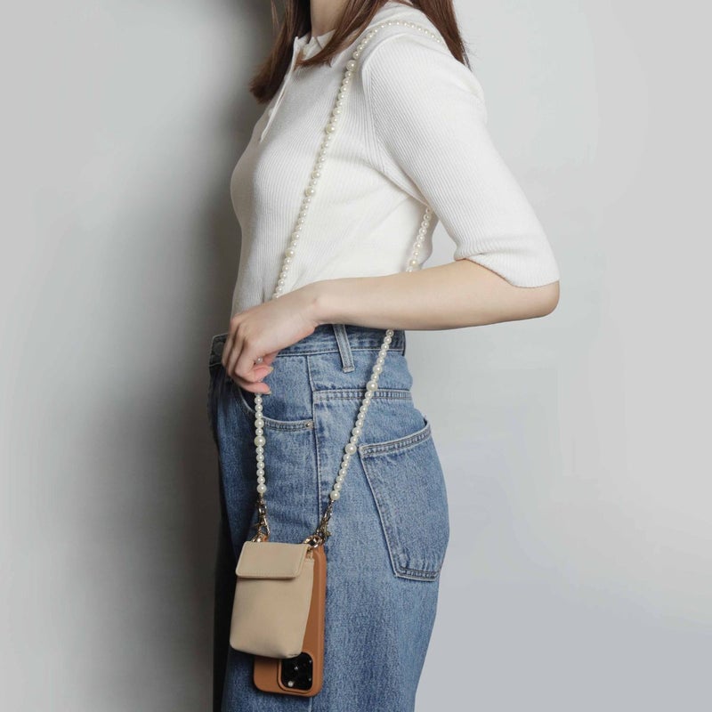 プティポーチチェーン付きiPhoneケース パールショルダー(ブラウン)