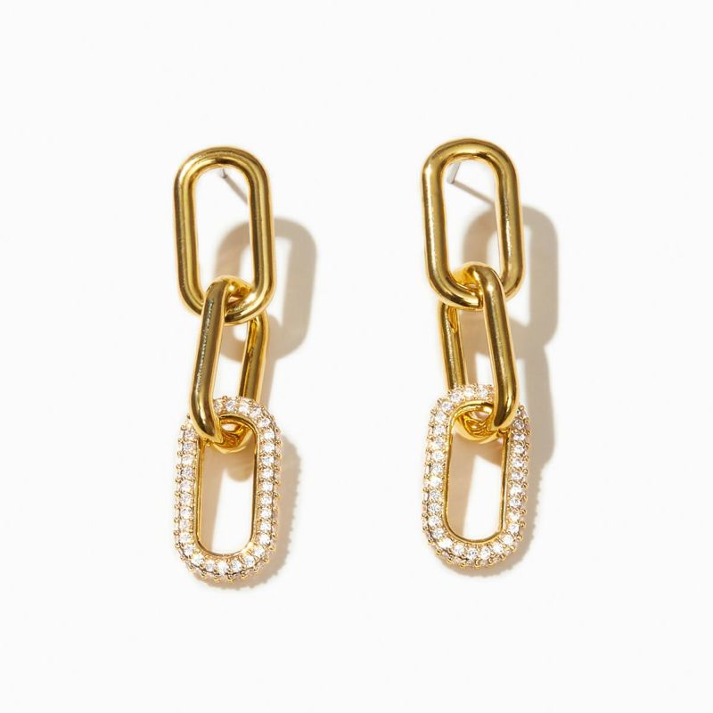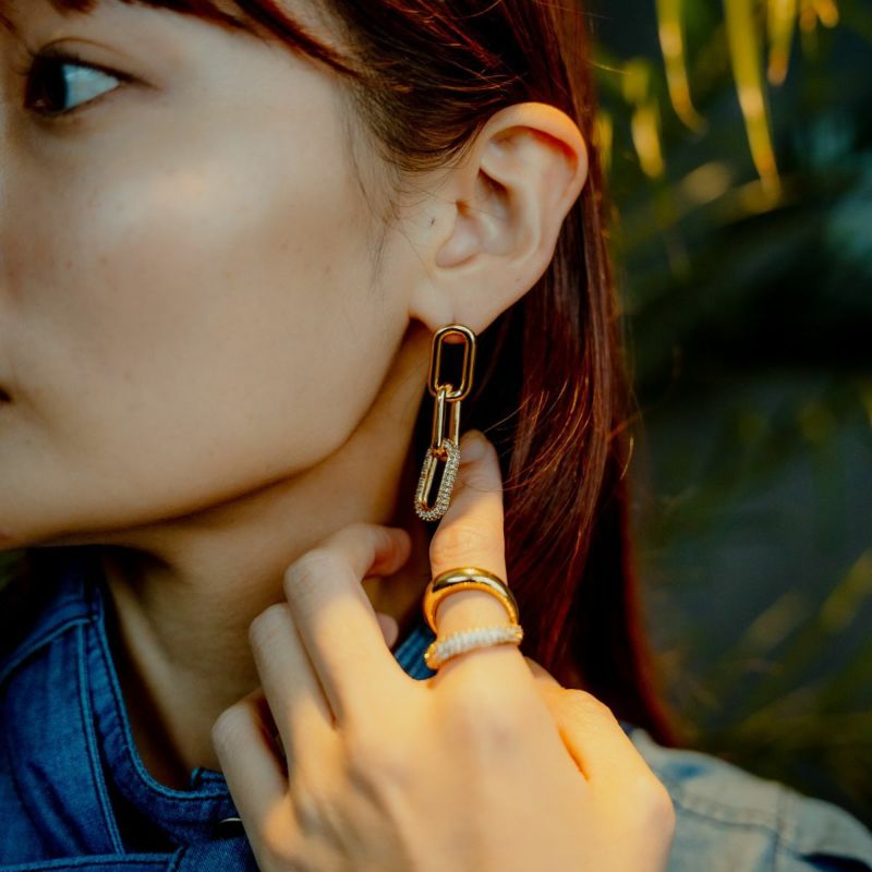 重厚感あるチェーンも、ジルコニアの繊細な輝きを合わせることでレディライクに。大ぶりチェーンに極小のジルコニアの輝きが品のあるデザインです。見た目以上につけ心地は軽いのが嬉しいポイント。一気におしゃれな印象を与える大ぶりのメタルピアスは、デイリースタイルに合わせやすく毎日に寄り添うアイテムになります。