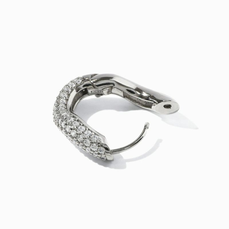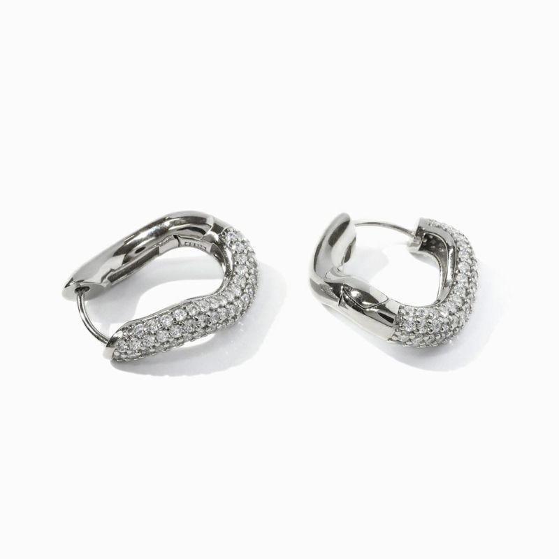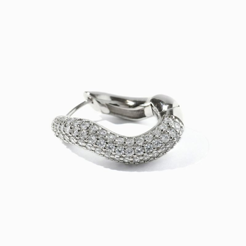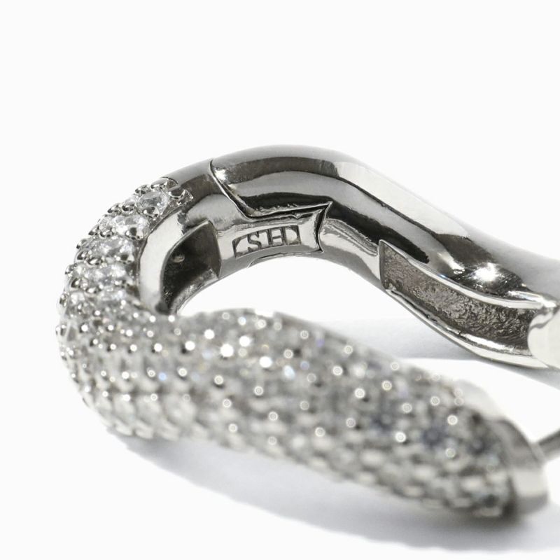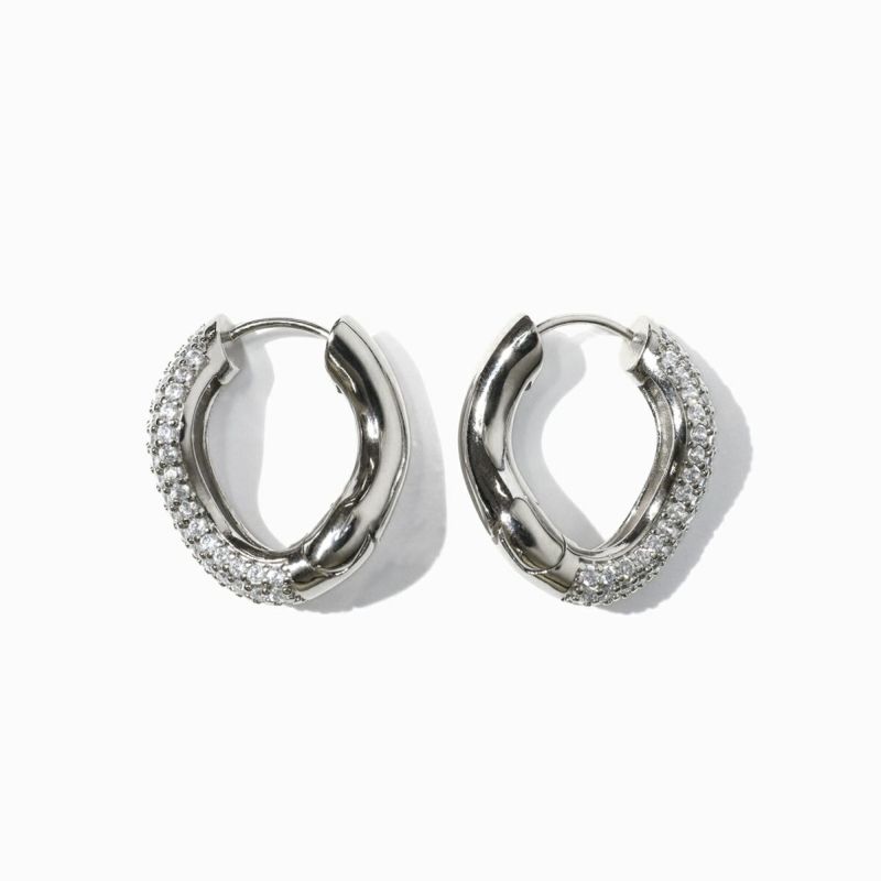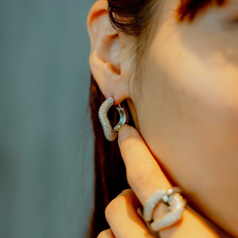 美しいウェーブラインがコーディネートを引き締めてくれる一つでも充分な存在感のピアス。重厚感のある真鍮にシルバーコーティングを施し、立体感がでるように縦にウェーブラインをいれることで光を反射して角度によって魅せるきらめきが華やかに仕上げてくれます。ゆるやかな曲線のフープピアスに品のあるジルコニアの繊細な輝きを半分だけ散りばめることで、大人の日々のコーディネートに寄り添い、カジュアルからきれいめまでデイリーに活躍してくれるアイテム。同シリーズのアイテムと合わせてより華やかな印象に。