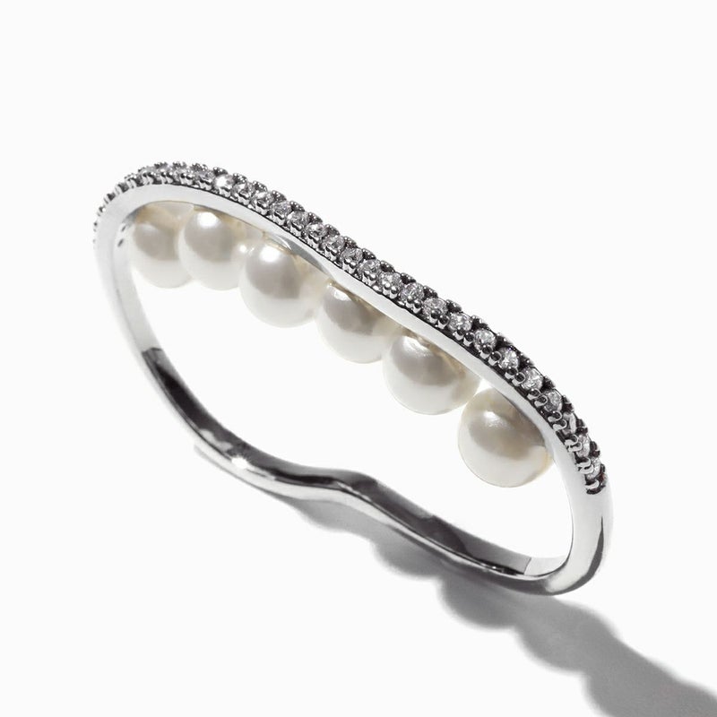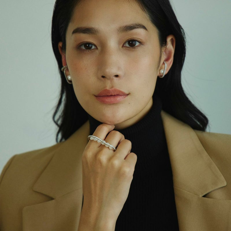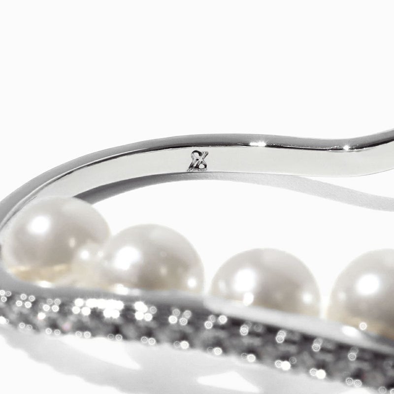 パールが宙に浮いたような立体デザインで存在感を、きめ細かなパヴェジルコニアのラインは、強度も柔らかさもある真鍮ならでは。ボディはストレスフリーでお使いいただけるよう、フィットするデザインに。
