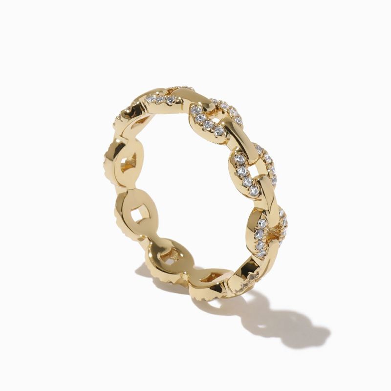 チェーンが連なったような優美なフォルムに、キュービックジルコニアを贅沢にセッティングしたリング。
