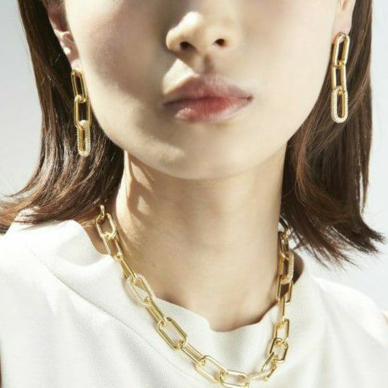 重厚感あるチェーンも、ジルコニアの繊細な輝きを合わせることでレディライクに。大ぶりチェーンに極小のジルコニアの輝きが品のあるデザインです。見た目以上につけ心地は軽いのが嬉しいポイント。一気におしゃれな印象を与える大ぶりのメタルアイテムは、デイリースタイルに合わせやすく毎日に寄り添うアイテムになります。ひとつでも存在感ありますが、セットで着けていただくとより華やかさを増してくれます。どのアイテムも揃えて持っておきたい人気シリーズのお得なセットです。