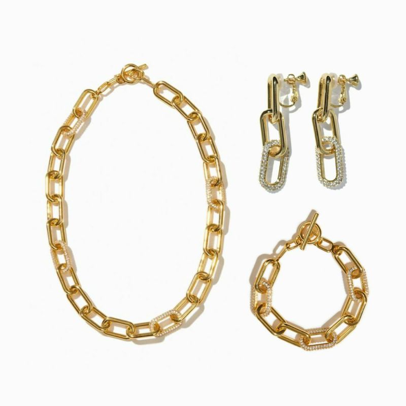 重厚感あるチェーンも、ジルコニアの繊細な輝きを合わせることでレディライクに。大ぶりチェーンに極小のジルコニアの輝きが品のあるデザインです。見た目以上につけ心地は軽いのが嬉しいポイント。一気におしゃれな印象を与える大ぶりのメタルアイテムは、デイリースタイルに合わせやすく毎日に寄り添うアイテムになります。ひとつでも存在感ありますが、セットで着けていただくとより華やかさを増してくれます。どのアイテムも揃えて持っておきたい人気シリーズのお得なセットです。