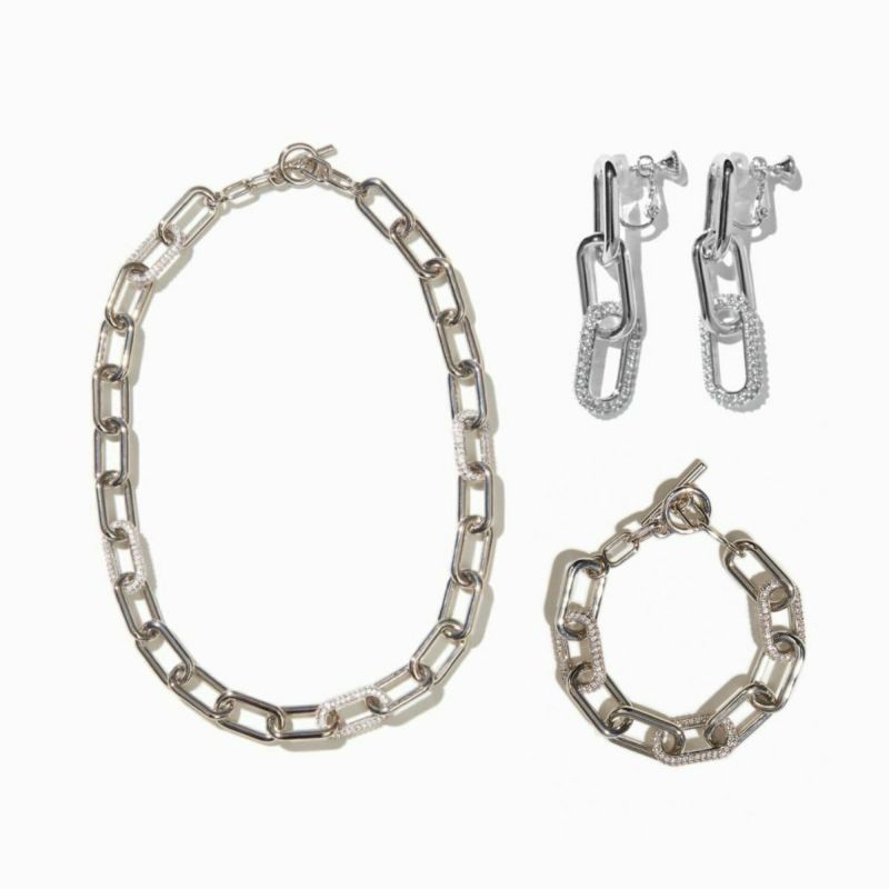 重厚感あるチェーンも、ジルコニアの繊細な輝きを合わせることでレディライクに。大ぶりチェーンに極小のジルコニアの輝きが品のあるデザインです。見た目以上につけ心地は軽いのが嬉しいポイント。一気におしゃれな印象を与える大ぶりのメタルアイテムは、デイリースタイルに合わせやすく毎日に寄り添うアイテムになります。ひとつでも存在感ありますが、セットで着けていただくとより華やかさを増してくれます。どのアイテムも揃えて持っておきたい人気シリーズのお得なセットです。