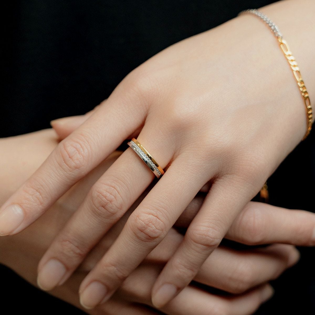 異なる輝きが溶け合い、 あなたの日常に新たな表情を。 ゴールドの温もりとシルバーの力強さが 織りなす多面的な美しさをまとう。