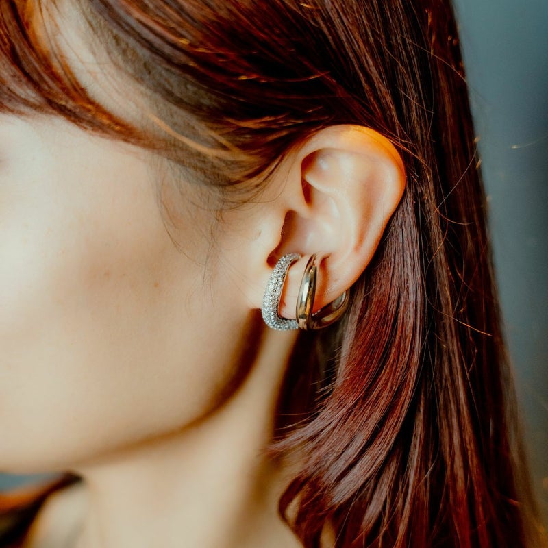 イヤーカフとしてもリングとしても楽しめるマルチなアイテム。表情が異なる2本セットなのでコーデイネートの幅が広がるのも嬉しいポイントです。贅沢にあしらったジルコニアの輝きを際立たせ、ラグジュアリーな雰囲気に。ゆるやかな曲線にすることで立体感が出て耳元、手元をしなやかに馴染んで上品な印象にしています。コーディネートを選ばずカジュアルにもきれいめにもデイリーに活躍してくれるアイテムです。同シリーズのネックレス、ブレスレットと合わせてより華やかな印象に。フォーマルシーンはもちろん、女子会など幅広いシーンでお使いいただけます。