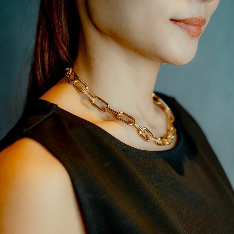 重厚感あるチェーンも、ジルコニアの繊細な輝きを合わせることでレディライクに。大ぶりチェーンに極小のジルコニアの輝きが品のあるデザインです。見た目以上につけ心地は軽いのが嬉しいポイント。一気におしゃれな印象を与える大ぶりのメタルネックレスは、デイリースタイルに合わせやすく毎日に寄り添うアイテムになります。
