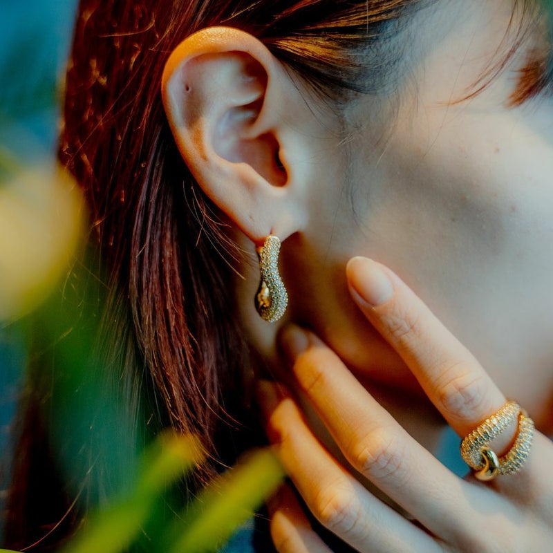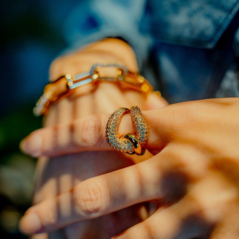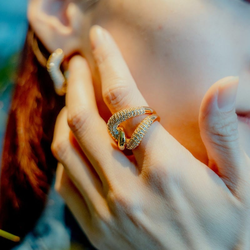 幅の異なるラインが美しいウェーブを描くボリュームのあるリング。「縁」や「絆」を象徴するノットディティールは、運気を上げ自分に自信をもたらします。K18ゴールドコーティングが贅沢に散りばめたジルコニアの輝きをより一層引き立て、お手元にインパクトを与えます。コーディネートを選ばずカジュアルにもきれいめにもデイリーに活躍してくれるアイテム。 同シリーズのアイテムと合わせてより華やかな印象に。
