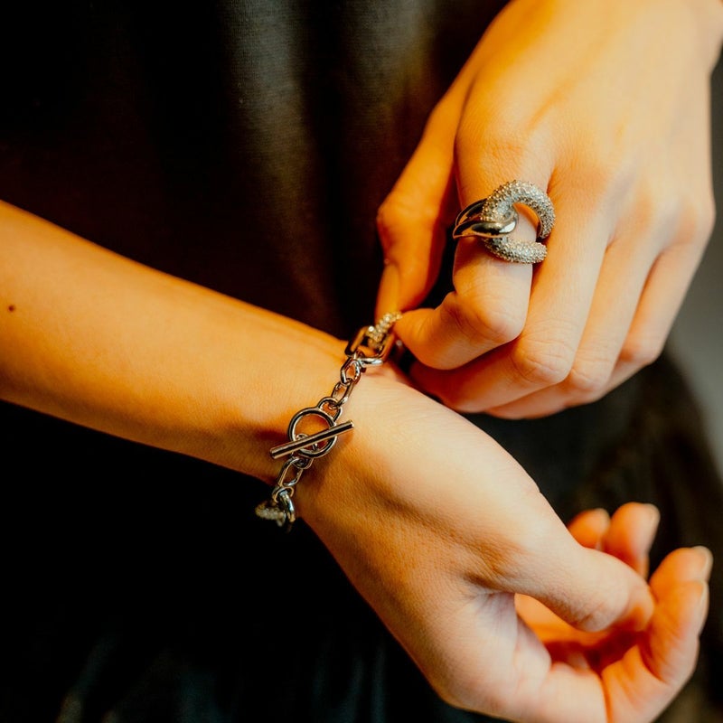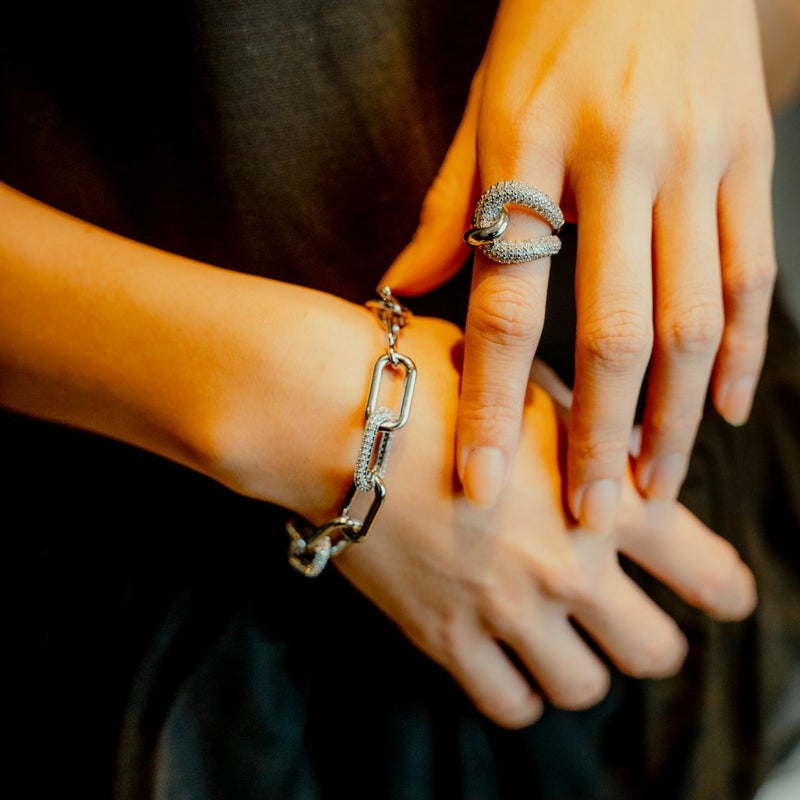 幅の異なるラインが美しいウェーブを描くボリュームのあるリング。「縁」や「絆」を象徴するノットディティールは、運気を上げ自分に自信をもたらします。シルバーコーティングが贅沢に散りばめたジルコニアの輝きをより一層引き立て、お手元にインパクトを与えます。コーディネートを選ばずカジュアルにもきれいめにもデイリーに活躍してくれるアイテム。 同シリーズのアイテムと合わせてより華やかな印象に。