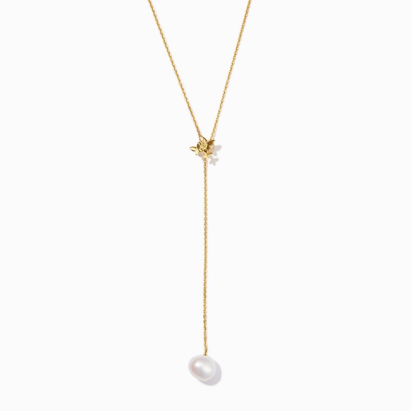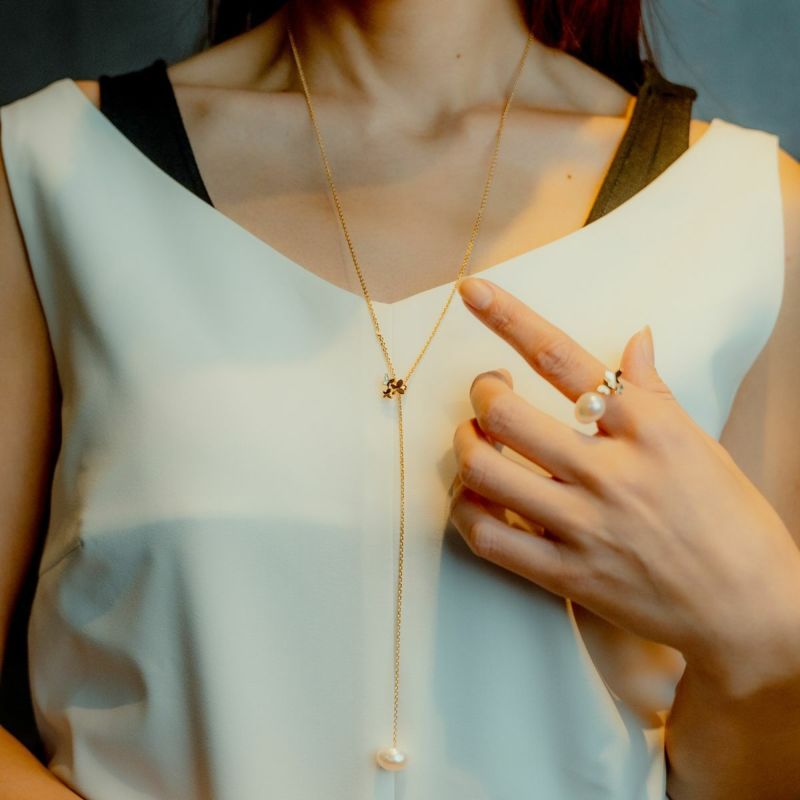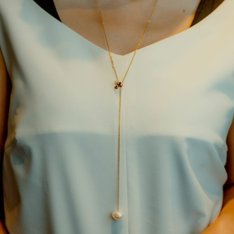 みずみずしい淡水パールに、蝶たちが飛び舞う様子を表現した、長さが変えられるロングネックレス。 柔らかく加工のしやすい真鍮を使用することで、立体感のあるオリジナルの蝶の形にこだわりました。K16ゴールドコーティングの輝きは淡水パールの照り、ツヤをより一層引き立たせエレガントな雰囲気に。全長70㎝あり、カジュアルからキレイめまでお洋服に合わせて長さを変えられるマルチなネックレス。