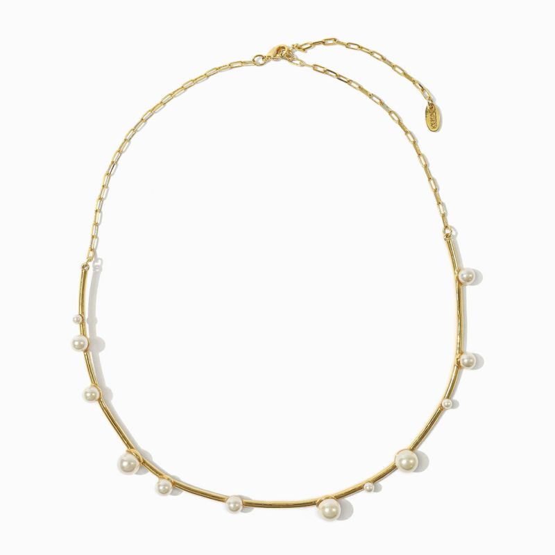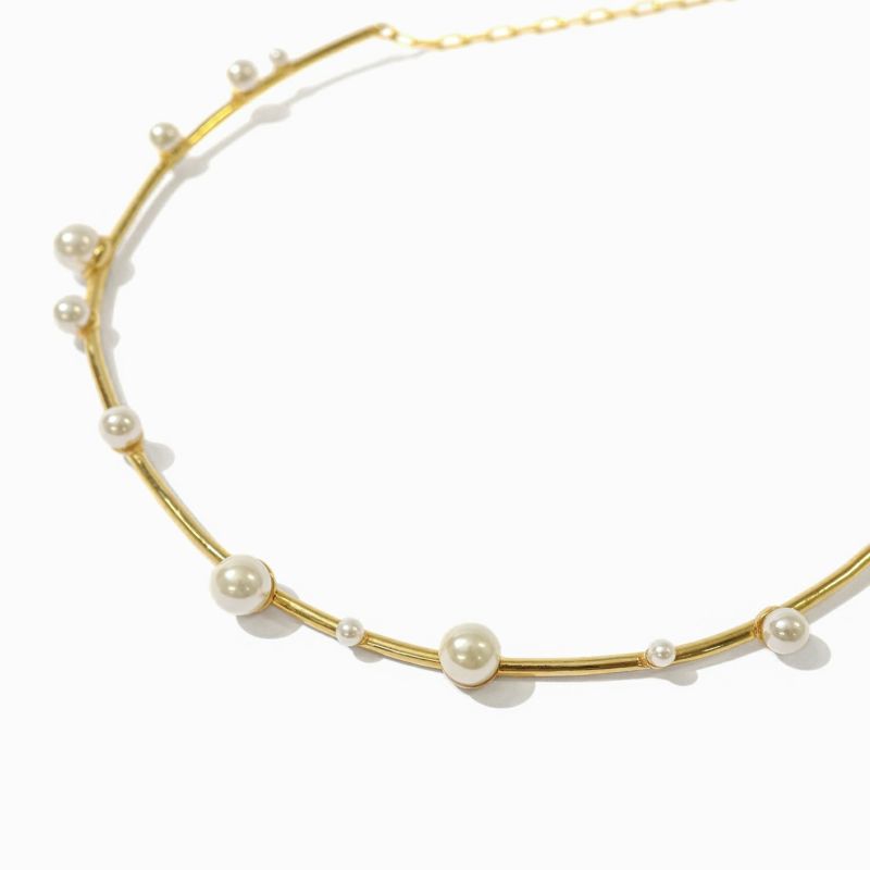 シェルパールをランダムに配置することでエアリー感を演出し、ゴールドのラインがコーディネートを引きしめてくれるメリハリのあるデザイン。