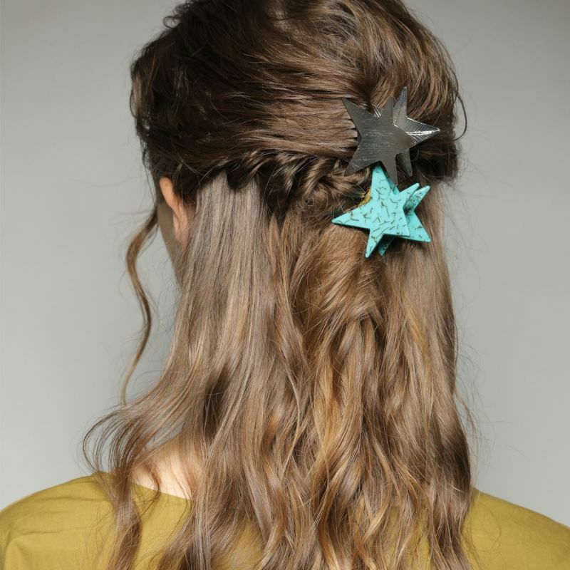 大人っぽいマーブル模様とメタルのスタークリップ。 ヘアアレンジに着けるだけでお洒落で可愛く決まるベストセラーアイテム。 ヘアスタイルのワンポイントとしてラフなまとめ髪に留めるだけでこなれたスタイルを印象付けます。ありそうでなかった星モチーフのバンスクリップ。ヘアメイクアーティストならではの視点で着用時のフィット感、つけ心地にこだわって金型からオリジナルで作りました。ハーフアップ、フルアップのスタイリングのポイントにオススメのアイテムです。