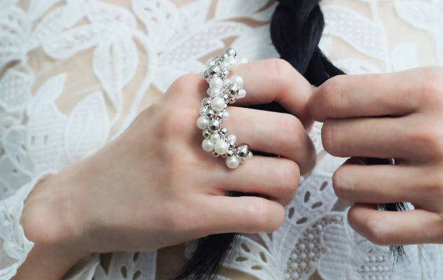 シルバーの地金と相性のいいシェルパールをあしらった、クリーンで洗練されたシリーズ。